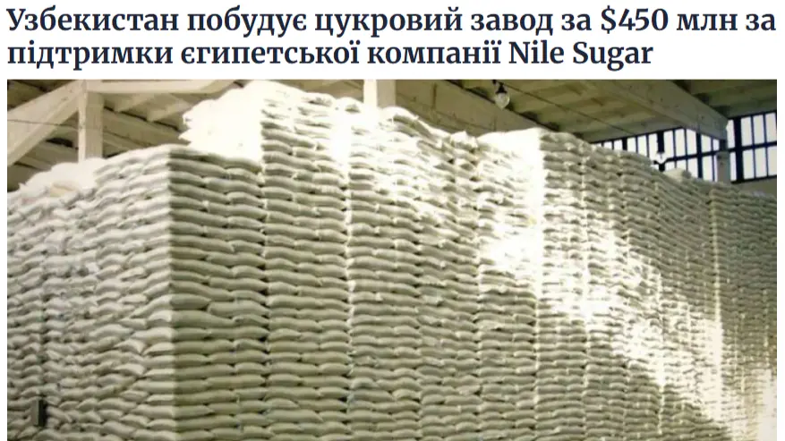 Ukrainaning, “Fixygen” nashriga ko‘ra, mazkur loyiha yiliga 200 ming tonnagacha shakar ishlab chiqarishni ko‘zda tutadi. Investitsiyalarning umumiy hajmi 450 million AQSh dollariga baholanmoqda va u to‘g‘ridan-to‘g‘ri xorijiy investitsiyalar shaklida amalga oshiriladi. Qishloq xo‘jaligi vaziri Ibrohim Abdurahmonovning taʼkidlashicha, davlatimiz rahbari loyihani alohida nazoratga olish va qisqa muddatlarda ijrosiga kirishish bo‘yicha topshiriq bergan.