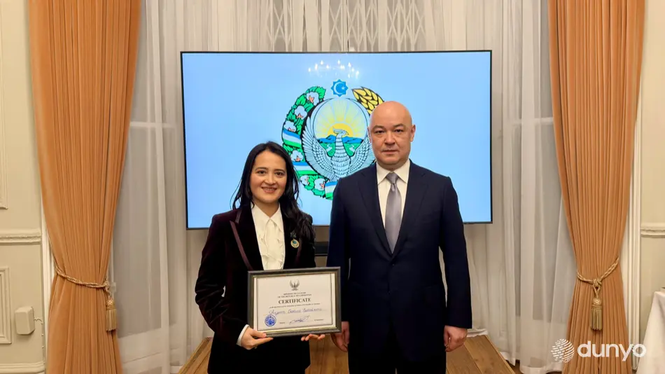 LONDON, 12-fevral. /“Dunyo” AA/. London shahrida O‘zbekiston Madaniyat vazirligi tomonidan taʼsis etilgan “O‘zbek madaniyati elchisi” ko‘krak nishoni va tegishli sertifikatni tantanali topshirish marosimi bo‘lib o‘tdi, deb xabar qilmoqda “Dunyo” AA muxbiri.
