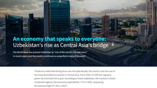 Maqolada Buyuk Britaniya va Xitoy, Rossiya, Turkiya, Qozog‘iston kabi hamkor davlatlar bilan savdo va investitsiya aloqalari faol rivojlanayotgani, shuningdek tadbirkorlik muhiti soddalashtirilgani ham qayd etilgan. Yagona raqamli platforma orqali kompaniyalarning ro‘yxatdan o‘tishi va biznes boshlash imkoniyati mamlakatni Markaziy Osiyodagi iqtisodiy yo‘lakka aylantirmoqda.