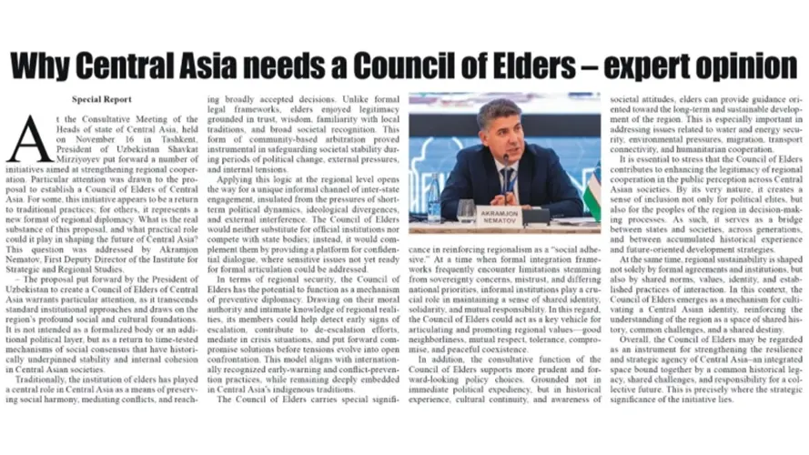 “O‘zbekiston Prezidentining Markaziy Osiyo Oqsoqollar kengashini tashkil etish tashabbusi haqiqatan ham alohida eʼtiborga loyiq, chunki u odatiy institutsional yechimlar doirasidan chiqib, mintaqamizning chuqur ijtimoiy va madaniy mantig‘iga tayanadi. Gap rasmiy organ yoki siyosiy tuzilma haqida emas, balki Markaziy Osiyo jamiyatlarining barqarorligi va ichki uyg‘unligini tarixan taʼminlab kelgan ijtimoiy kelishuv mexanizmlariga qaytish haqida bormoqda, – deydi SMTI direktorining birinchi o‘rinbosari. – Markaziy Osiyo jamiyatlari tarixan ijtimoiy tinchlikni saqlash, nizolarni hal qilish va kelishilgan yechimlarni ishlab chiqish mexanizmi sifatida oqsoqollar institutiga tayangan”.