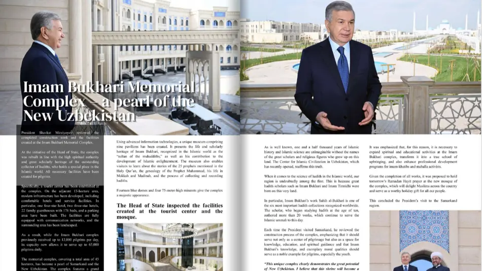 Bundan tashqari, nashrda O‘zbekiston Prezidenti tashabbusi bilan Toshkent shahrida barpo etilgan Islom sivilizatsiyasi markazi, Samarqand viloyatida qayta tiklangan Imom Buxoriy majmuasi, yurtimizning turizm sohasida amalga oshirilayotgan yangilanishlarga bag‘ishlangan turkum maqolalar ham joy olgan. O‘zbekiston–Pokiston munosabatlarining bugungi holati va istiqbollari ham alohida yoritilgan.