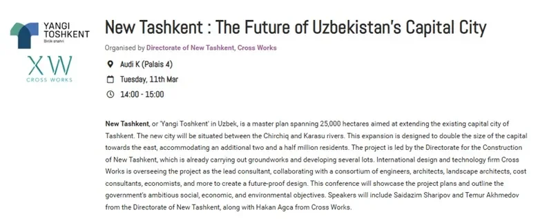 «С докладами выступят Саидазим Шарипов и Темур Ахмедов из Дирекции Нового Ташкента, а также основатель и управляющий директор компании «Cross Works» Хакан Агча, который возглавляет проектирование и координирует работу консорциума, занимающегося разработкой генерального плана Нового Ташкента», – информирует официальный сайт MIPIM.
