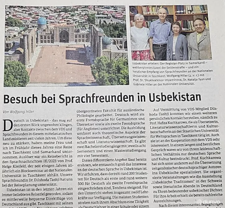 «Мы посетили Узбекистан, чтобы еще больше укрепить давние связи между обществом «Verein Deutsche Sprache e.V.» и узбекистанцами, изучающими немецкий язык», ‑ пишет автор статьи, член общества, профессор Вольфганг Хиллер.