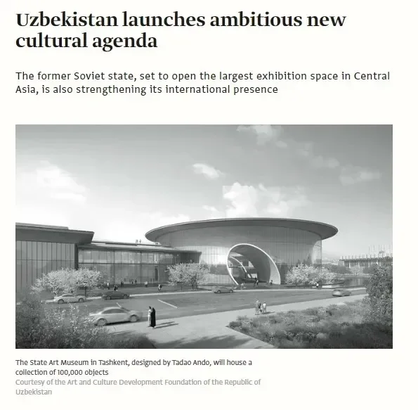 «Некоторые из запланированных музейных проектов включают строительство нового Государственного художественного музея, разработанного архитектурным бюро «Tadao Ando Architects & Associates» в столице Узбекистана, – говорится в статье. – С коллекцией из более чем 100 тысяч объектов, музей, который пока не объявил дату открытия, готов стать крупнейшим выставочным пространством в Центральной Азии, площадью более 40000 квадратных метров».
