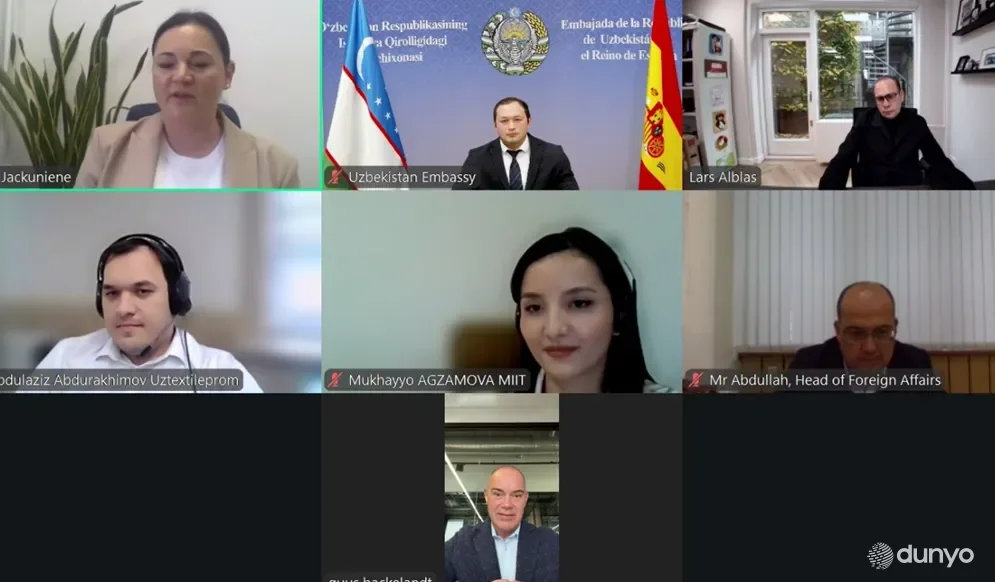 МАДРИД, 9 ноября. /ИА «Дунё»/. Посольством Узбекистана совместно с Министерством инвестиций, промышленности и торговли, Ассоциацией текстильной и швейной промышленности и Агентства по техническому регулированию при Кабинете Министров, проведена видеоконференция с руководством испанских компаний «Grosso Moda Manufacturing» и «NBC Nhabe Corporation», сообщает корреспондент ИА «Дунё».