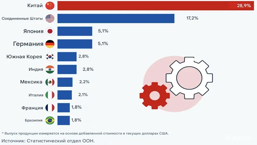По оценке независимого источника «World Population Review», к 2025 году доля Китая достигла 31,63%, а объём добавленной стоимости в промышленности составил почти 5 триллионов долларов. США в это же время удержали второе место с долей в 15,87% и объёмом производства около 2,5 триллиона долларов соответственно.