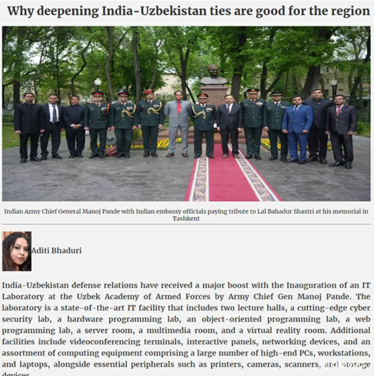 «Оборонные отношения Индии и Узбекистана получили значительный импульс после открытия IТ-лаборатории в Академии Вооруженных сил Узбекистана, – пишет Адити Бхадури. – Лаборатория представляет собой современный центр информационных технологий, включающий в себя два лекционных зала, современные лаборатории кибербезопасности, аппаратного и объектно-ориентированного программирования, веб-программирования, серверную комнату, мультимедийный центр и комнату виртуальной реальности. Дополнительные возможности включают терминалы видеоконференций, интерактивные панели, сетевые устройства и ассортимент компьютерного оборудования, включающий большое количество высокопроизводительных персональных компьютеров, рабочих станций и ноутбуков, а также необходимые периферийные устройства, такие как принтеры, камеры, сканеры и устройства хранения данных».