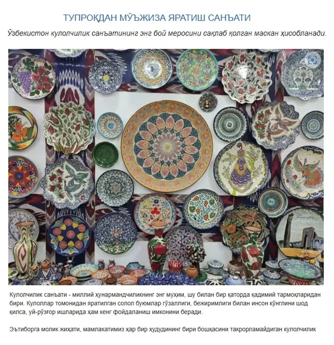 В ней отмечается, что гончарное искусство является одной из важнейших древних отраслей народного ремесла в Узбекистане. Созданные мастерами керамические изделия не только доставляют эстетическое удовольствие, но и широко используются в хозяйственных целях.