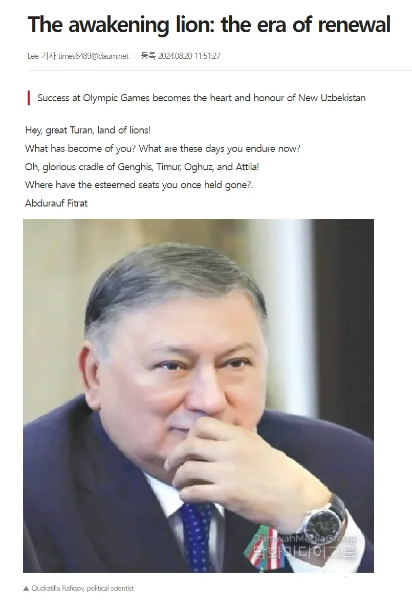 СЕУЛ, 21 августа. /ИA «Дунё»/. В южнокорейском журнале «Diplomacy Journal» опубликована статья политолога Кудратиллы Рафикова “Пробуждающийся лев: эпоха обновления”, сообщает корреспондент ИА «Дунё».