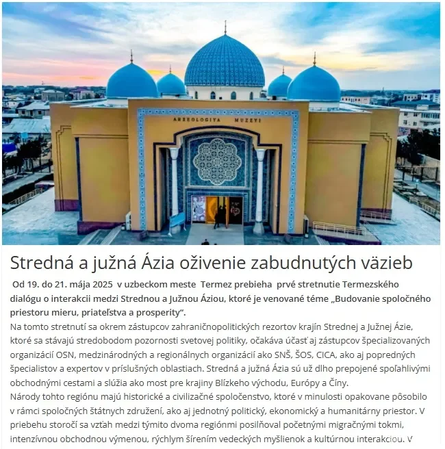 Так, в авторитетной словацкой газете «Finančné Noviny» опубликована статья под заголовком «Центральная и Южная Азия: шаги по восстановлению забытой связи», в которой сообщается, что с 19 по 21 мая 2025 года в городе Термезе проходит первое заседание Термезского диалога по взаимодействию двух регионов.