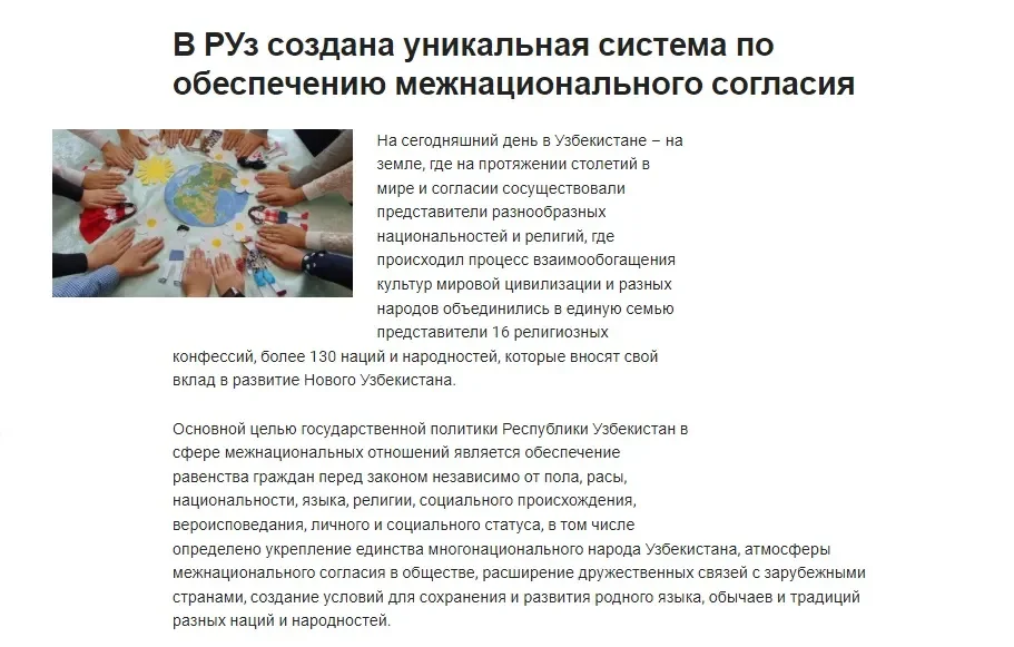 “Создан отдельный государственный орган - Комитет по межнациональным отношениям и дружественным связям с зарубежными странами при Кабинете Министров Республики Узбекистан, - говорится в статье. - Комитет в сотрудничестве со 157 национальными культурными центрами, 38 обществами дружбы и 98 обществами соотечественников за рубежом вносит значительный вклад в обеспечение межнационального и межрелигиозного согласия, развитие дружественных связей с зарубежными странами”.