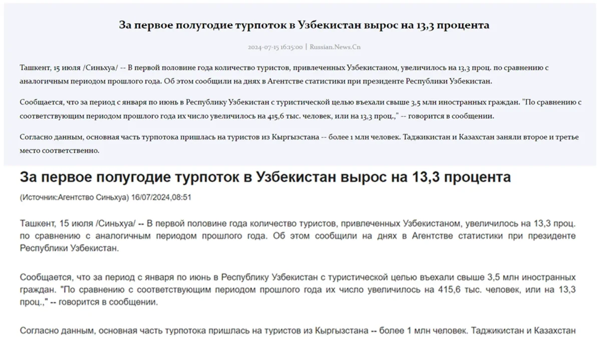 В публикациях сообщается, что в первой половине текущего года количество туристов, привлеченных Узбекистаном, увеличилось на 13,3 процента по сравнению с аналогичным периодом прошлого года.