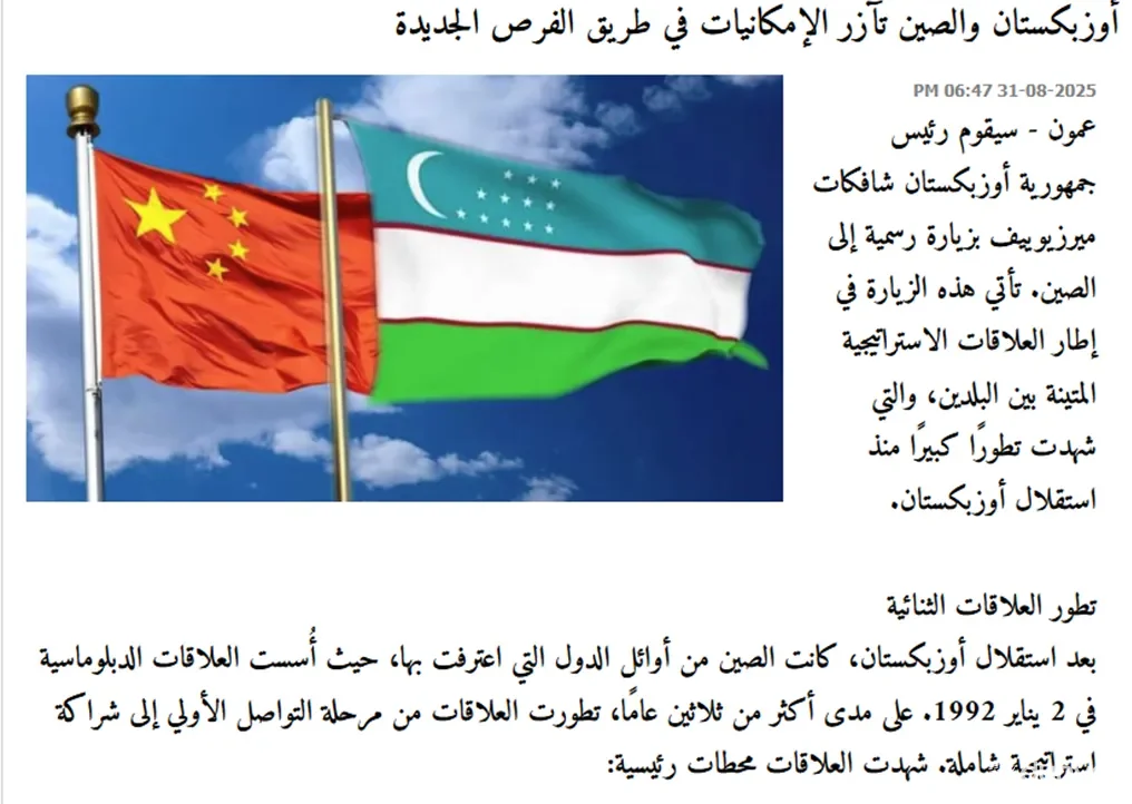 АММАН, 3 сентября. /ИА «Дунё»/. В иорданской газете «Ammon News» опубликована статья, посвященная сотрудничеству между Узбекистаном и Китаем, сообщает корреспондент ИА «Дунё».