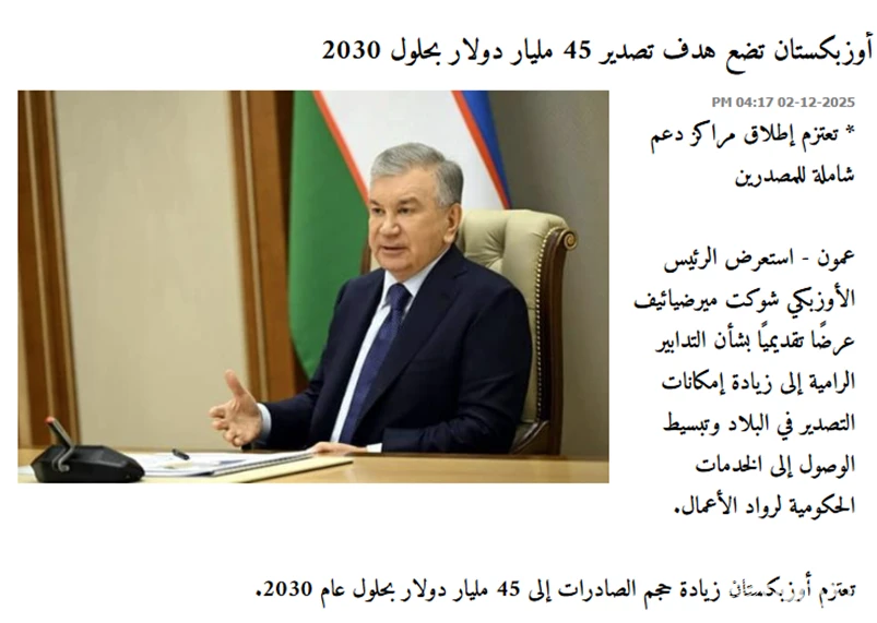 АММАН, 4 декабря. /ИА «Дунё»/. В ведущей иорданской газете «Ammon News» опубликована статья, посвящённая планам Узбекистана увеличить экспорт до 45 миллиардов долларов к 2030 году, сообщает корреспондент ИА «Дунё».