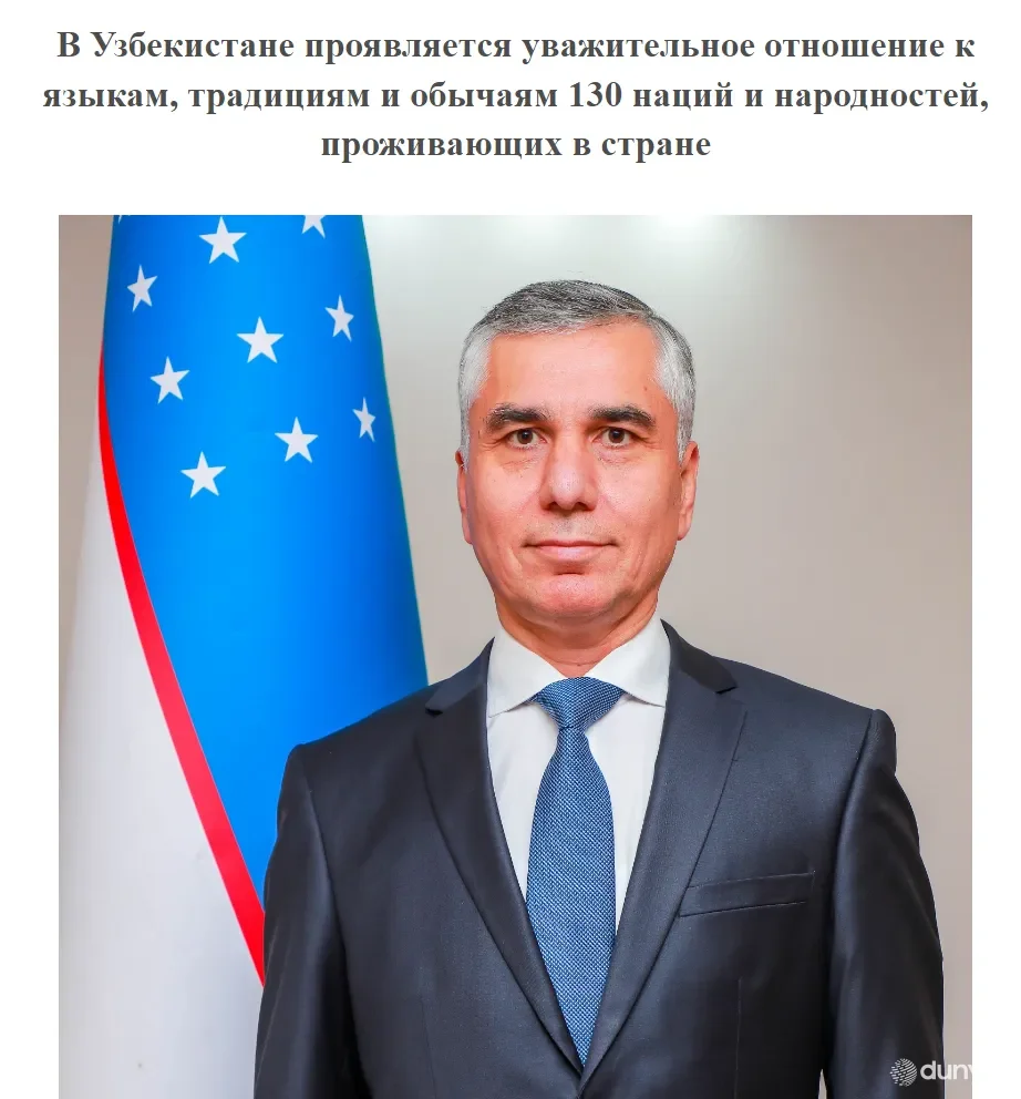 Автор подчеркивает, что за последние семь лет для поддержки национальных культурных центров из Государственного бюджета Узбекистана всего было выделено средств на 35 миллиардов сумов. В соответствии со специальной резолюцией «Просвещение и религиозная толерантность», принятой Генеральной Ассамблеей ООН в 2018 году по предложению лидера Узбекистана, в нашей стране ежегодно проводится «Неделя толерантности», посвященная 16 ноября – Международному дню толерантности, которая еще больше укрепляет дружбу.