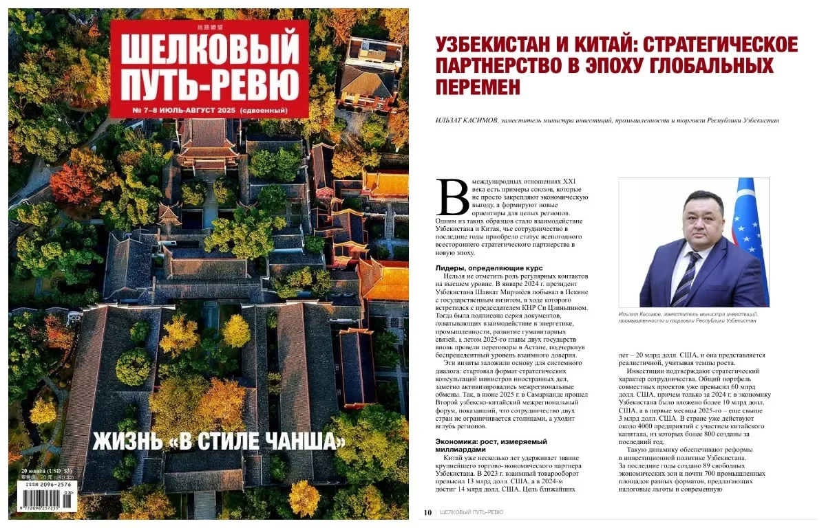 ПЕКИН, 7 сентября. /ИА «Дунё»/. На страницах китайского журнала «Шелковый путь-ревю» опубликована статья под заголовком «Узбекистан и Китай: стратегическое партнерство в эпоху глобальных перемен», сообщает корреспондент ИА «Дунё».