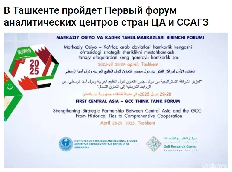 В ней отмечается, что в Ташкенте 28–29 апреля состоится Первый форум аналитических центров стран Центральной Азии и ССАГЗ на тему «Укрепление стратегического партнерства: от исторических связей к всеобъемлющему сотрудничеству».