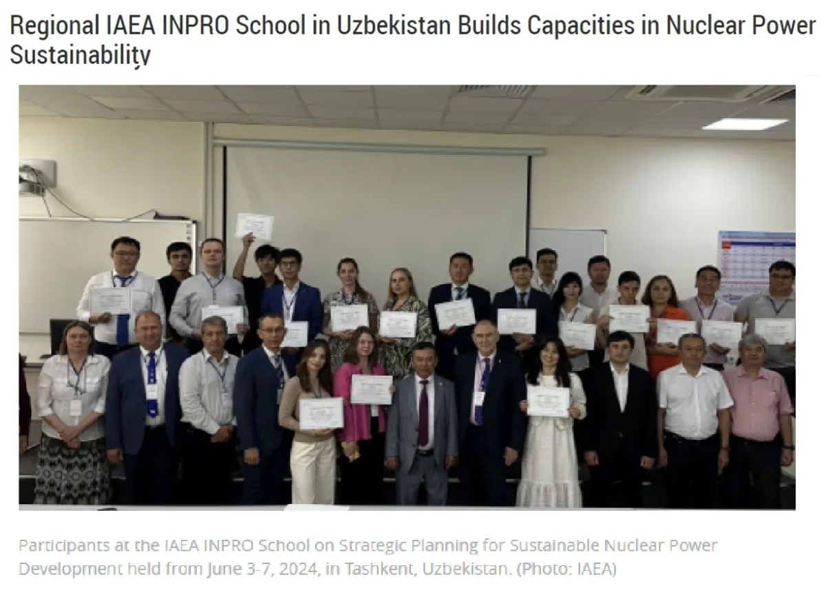 В ней рассказывается об успешном завершении проведенной в Ташкенте Региональной школой МАГАТЭ международного проекта по инновационным ядерным реакторам и топливным циклам - ИНПРО. В мероприятии приняли участие специалисты из Армении, Беларуси, Казахстана, Монголии, России, Таджикистана и Узбекистана.