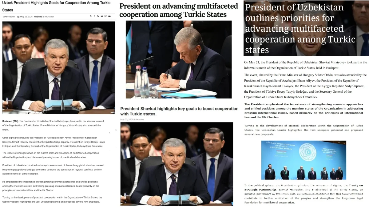В частности, информационное агентство “Global News Pakistan”, журналы “Pakistan in the World” и “The Diplomatic Insight”, газеты “The Asian Telegraph” и “Daily Big Digit”, новостные платформы “The Gulf Observer”, “The Europe Today” и “World News” опубликовали статьи об участии Президента Узбекистана Шавката Мирзиёева в неформальном саммите Организации тюркских государств (ОТГ), состоявшемся 21 мая в Будапеште.