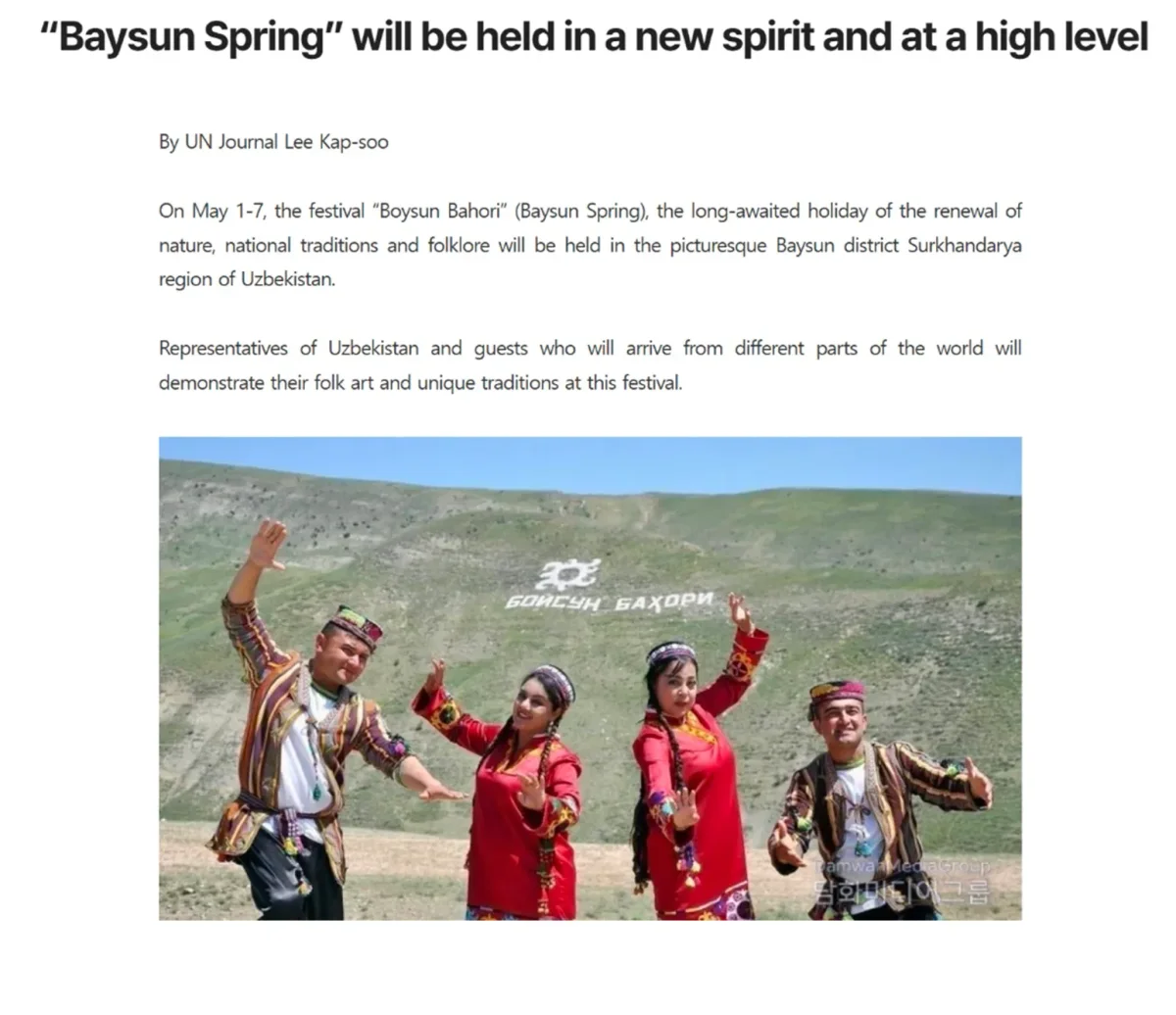 СЕУЛ, 24 апреля. /ИА "Дунё"/. Издающийся в Южной Корее журнал «UN Journal» анонсировал проведение фестиваля «Байсунская весна», который пройдет 1-7 мая в Сурхандарьинской области, передает корреспондент ИА «Дунё».