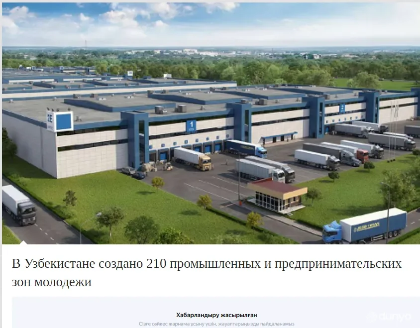 АСТАНА, 18 февраля. /ИА «Дунё»/ Казахстанское информационно-аналитическое издание «Инфозакон» опубликовало статью под заголовком «В Узбекистане создано 210 промышленных и предпринимательских зон молодежи», сообщает корреспондент ИА «Дунё».
