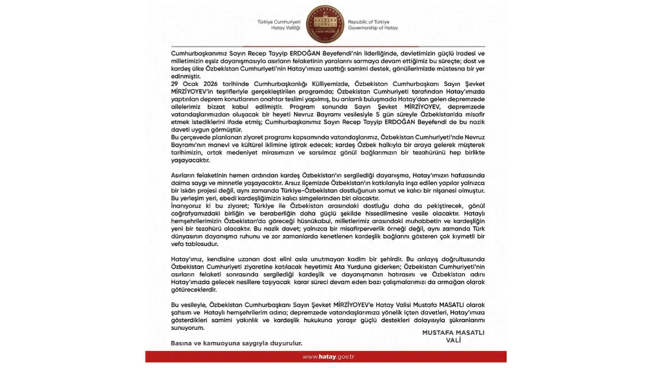 В частности, опубликовано благодарственное послание губернатора провинции Хатай Мустафы Масатлы и жителей региона, в котором выражается признательность узбекской стороне за приглашение.