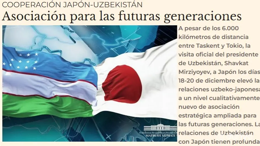 МАДРИД, 31 декабря. /ИА «Дунё»/. На испанском новостном портале «El Mundo Financiero» опубликована статья о развитии стратегического сотрудничества между Узбекистаном и Японией, сообщает корреспондент ИА «Дунё».
