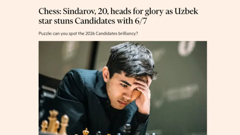 В публикации отмечается, что Жавохир Синдаров уже является явным фаворитом на победу в Турнире претендентов 2026 года на Кипре и на борьбу с индийцем Гукешем Доммараджу за титул чемпиона мира. «20-летний узбекский гроссмейстер начал турнир с уверенного результата 6/7, включая впечатляющую победу над своим главным соперником, фаворитом турнира и третьим шахматистом мира Фабиано Каруаной», - пишет издание.