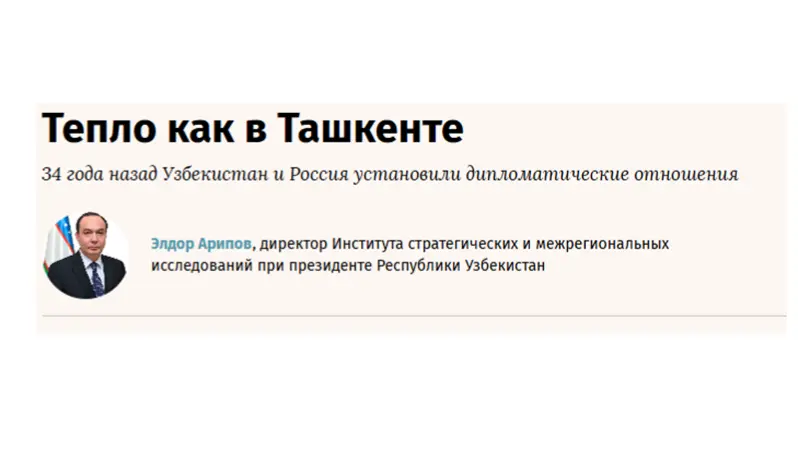 МОСКВА, 22 марта. /ИА «Дунё»/. В ведущей российской деловой газете «Ведомости» опубликована статья директора Института стратегических и межрегиональных исследований при Президенте Узбекистана Элдора Арипова под заголовком «Тепло как в Ташкенте. В рамках визита в Москву делегация Узбекистана. 34 года назад Узбекистан и Россия установили дипломатические отношения», сообщает передает корреспондент ИА «Дунё».