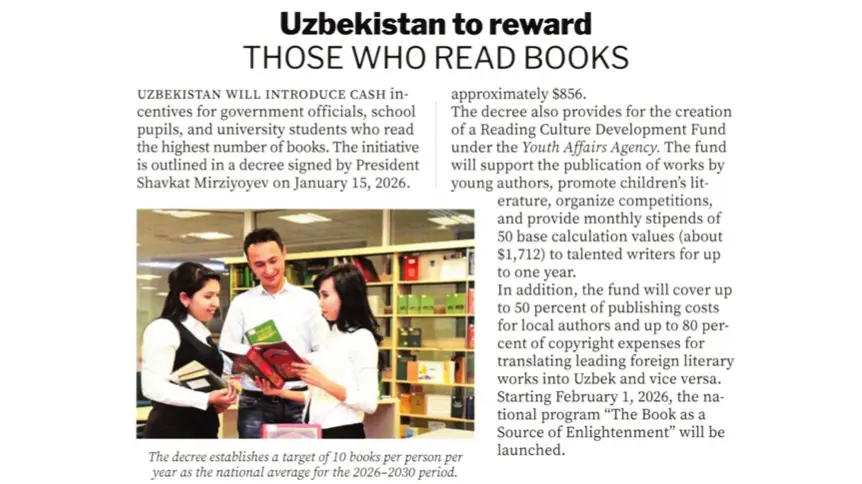 Журнал подчеркивает, что Узбекистан внедряет уникальную систему поддержки для самых активных читателей среди государственных служащих, школьников и студентов.