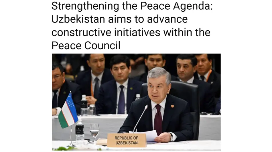 В ней отмечается, что 17–19 февраля Президент Шавкат Мирзиёев посетит США и примет участие в первом заседании Совета мира. Автор подчёркивает, что новая международная структура была учреждена в январе 2026 года на Всемирный экономический форум в Давосе как многосторонняя платформа для продвижения диалога и мирного урегулирования конфликтов.