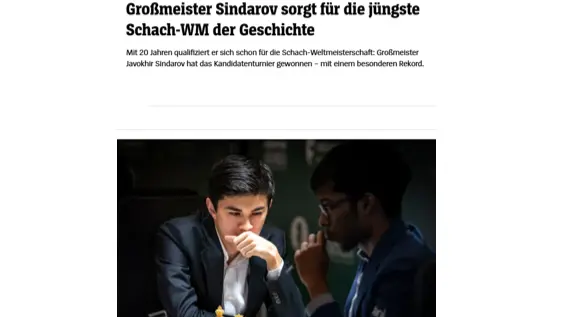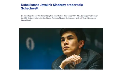 • 40БЕРЛИН, 18 апреля. /ИА «Дунё»/. Ведущие немецкие и международные СМИ, включая «ZEIT», «SPIEGEL», «Süddeutsche Zeitung», «Deutsche Welle» и «ChessBase», широко освещают успех узбекского гроссмейстера Жавохира Синдарова на турнире претендентов ФИДЕ 2026 года, сообщает корреспондент ИА «Дунё».