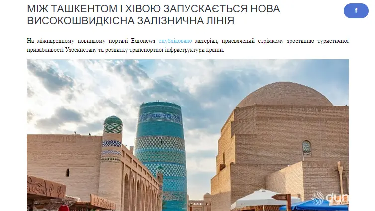 КИЕВ, 18 апреля. /ИА «Дунё»/. В Узбекистане вводится в эксплуатацию высокоскоростная железнодорожная линия между Ташкентом и Хивой, направленная на повышение туристической доступности регионов, сообщает корреспондент ИА «Дунё» со ссылкой на украинский журнал «Kyiv Diplomatic».