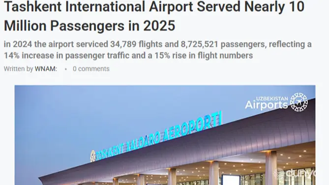 В частности, в репортаже под заголовком «Ташкентский международный аэропорт в 2025 году обслужил почти 10 миллионов пассажиров» сообщается, что по итогам 2025 года Ташкентский международный аэропорт сохранил статус крупнейшего авиационного узла страны. В течение года аэропорт обеспечивал регулярное авиасообщение со странами Европы, Азии, Ближнего Востока и СНГ.
