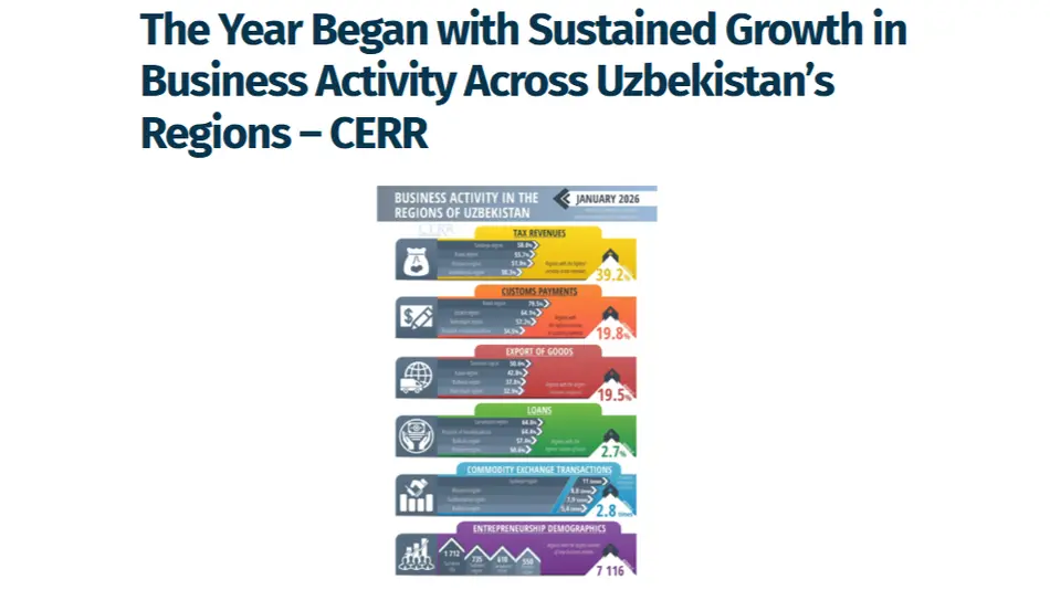 Отдельно отмечается активное развитие частного сектора: в январе 2026 года зарегистрировано 7 116 новых предприятий, лидируют Ташкент город (1 712), Ташкентская область (735), Самаркандская область (610) и Хорезмская область (550). Также выросла активность на биржах, особенно в Сирдарьинской области, где показатель увеличился в 11,1 раза.