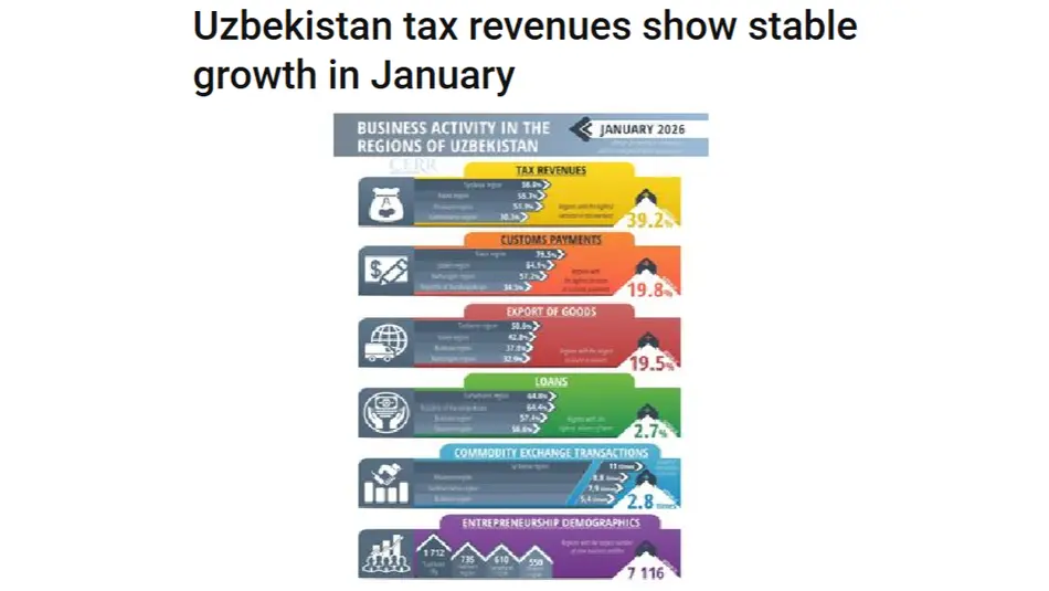 Согласно данным Центра экономических исследований и реформ (ЦЭИР), комплексный мониторинг показывает положительную динамику по всем основным показателям. Так, за январь 2026 года налоговые поступления увеличились на 39,2% по сравнению с аналогичным периодом прошлого года. Наибольший рост отмечен в Сирдарьинской, Навоийской, Хорезмской и Кашкадарьинской областях - в среднем около 49%. Доходы от подоходного налога выросли на 15,1%, налога на имущество - на 19,6%, земельного налога - на 20,3%.