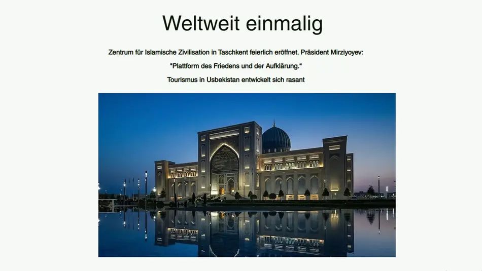 БЕРЛИН, 13 апреля. /ИА «Дунё»/. Ведущее немецкое онлайн-издание «Reiseblick», специализирующееся на сфере туризма, опубликовало аналитическую статью «Единственный в мире», посвященную деятельности Центра исламской цивилизации (ЦИЦ) в Ташкенте, сообщает корреспондент ИА «Дунё».
