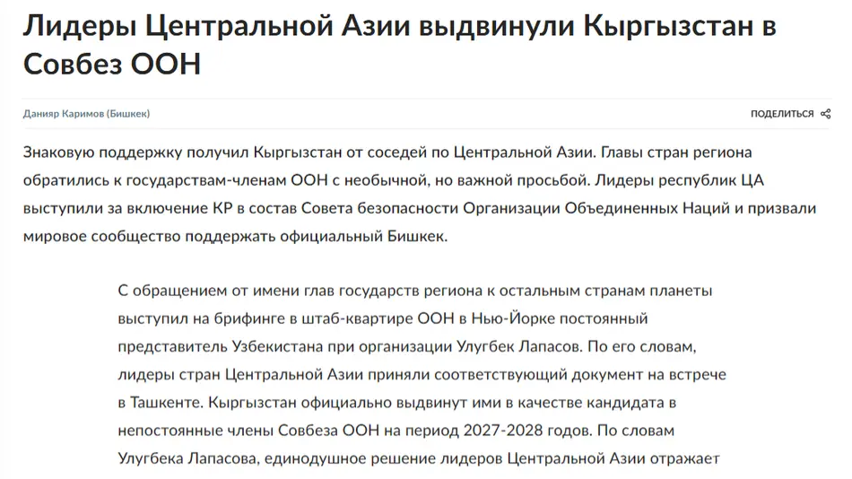 Отмечается, что с обращением от имени глав государств региона к остальным странам мира выступил на брифинге в штаб-квартире ООН в Нью-Йорке постоянный представитель Узбекистана при организации Улугбек Лапасов. По его словам, лидеры стран Центральной Азии приняли соответствующий документ на встрече в Ташкенте. Кыргызстан официально выдвинут ими в качестве кандидата в непостоянные члены Совбеза ООН на период 2027-2028 годов.