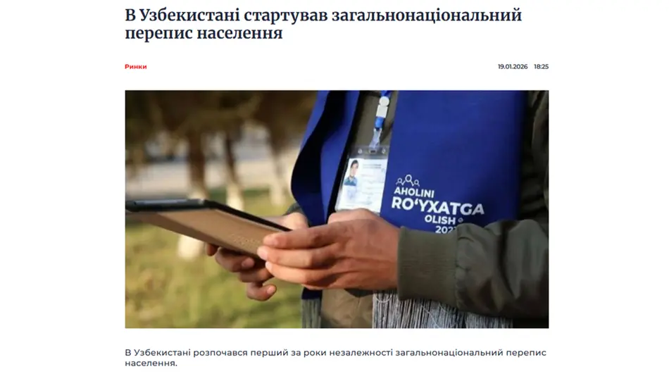 КИЕВ, 25 января. /ИА «Дунё»/. На украинских информационных порталах «Open4business» и «Fixygen» опубликована статья под заголовком «Общенациональная перепись населения стартовала в Узбекистане», сообщает корреспондент ИА «Дунё».
