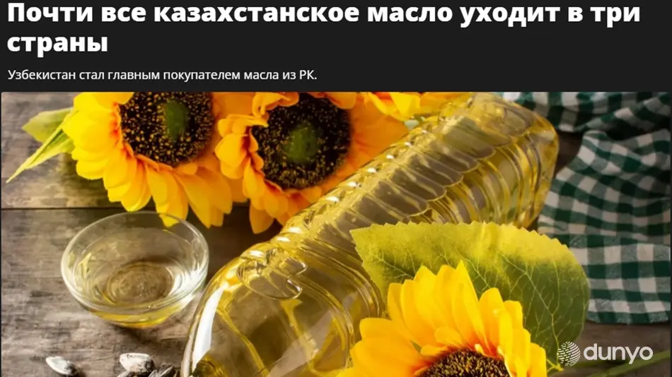 АСТАНА, 24 января. /ИА «Дунё»/. Лидирующую позицию среди стран, закупающих подсолнечное масло из Казахстана, уверенно сохраняет Узбекистан, сообщает корреспондент ИА «Дунё» со ссылкой на информагентство «inbusiness.kz».