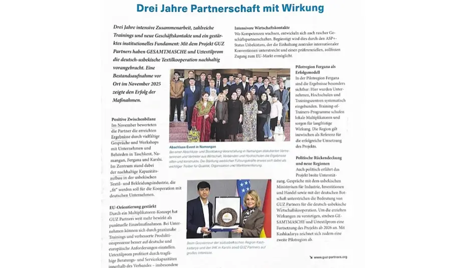 В частности, в ноябре 2025 года в рамках оценки трёхлетнего проекта командой «GUZ Partners» были проведены различные интервью и семинары с представителями предприятий и государственных органов в Ташкенте, Намангане, Фергане и Карши. Анализ данных мероприятий продемонстрировал высокую эффективность реализованных в рамках проекта мер. Основной акцент проекта был сделан на формирование устойчивого развития узбекской текстильной и швейно-трикотажной промышленности, а также на подготовку промышленных предприятий к сотрудничеству с немецкими компаниями отрасли.