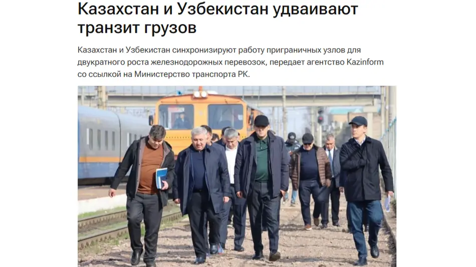Отмечается, что для реализации этой задачи объединённая делегация железнодорожных администраций Казахстана и Узбекистана совершила рабочую поездку по ключевым приграничным железнодорожным объектам. В рамках визита стороны синхронизировали работу приграничных узлов и согласовывали мероприятия по устранению инфраструктурных ограничений, влияющих на пропускную способность.