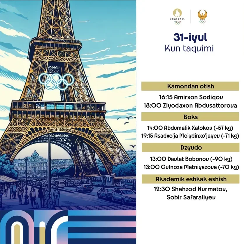 ТАШКЕНТ, 31 июля. /“Дунё” ИА/. В пятый день летних Олимпийских игр «Париж-2024» 8 спортсменов будут защищать честь Узбекистана в таких видах спорта, как академическая гребля, дзюдо, бокс и стрельба из лука, передает корреспондент ИА «Дунё».