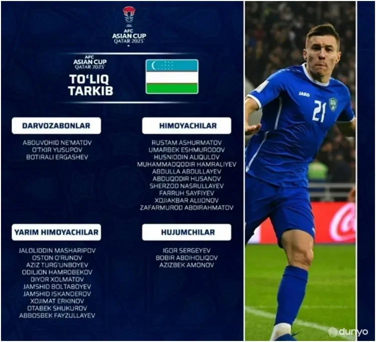 Отмечается, что капитан сборной Эльдор Шомуродов, к сожалению, не попал в этот список из-за травмы. Джамшид Болтабоев сыграет на Кубке Азии под номером 14.