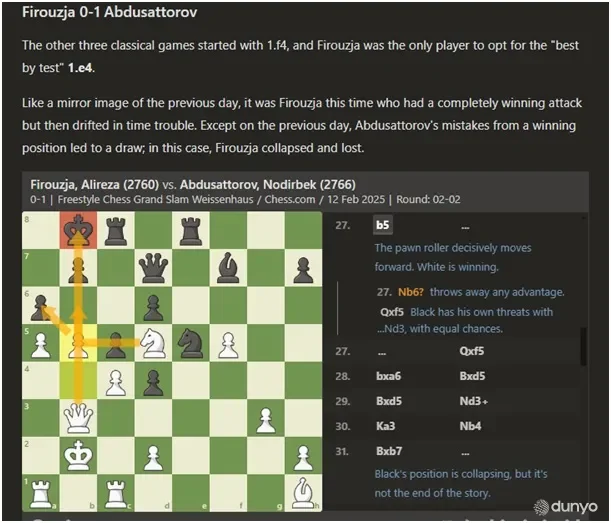 По данным авторитетного онлайн-портала Chess.com, Алиреза Фирузджа имел отличные шансы на победу, но Нодирбек Абдусатторов сумел кардинально изменить ход партии и вырвать победу в решающий момент.