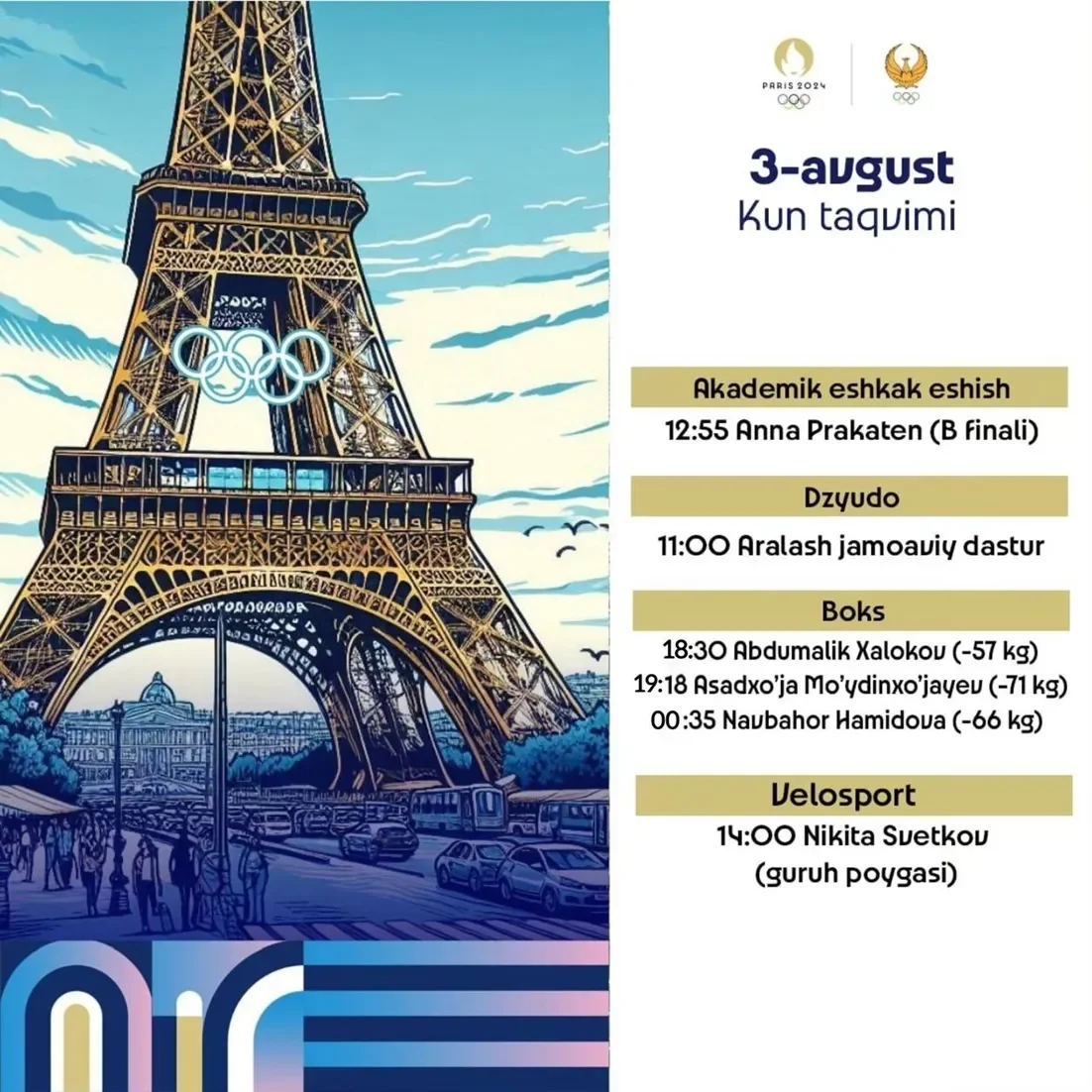 ТАШКЕНТ, 3 августа. /ИА «Дунё»/. В восьмой день летних Олимпийских игр «Париж-2024» 6 спортсменов будут защищать честь Узбекистана в таких видах спорта, как академическая гребля, дзюдо, бокс и велоспорт, сообщает корреспондент ИА «Дунё».