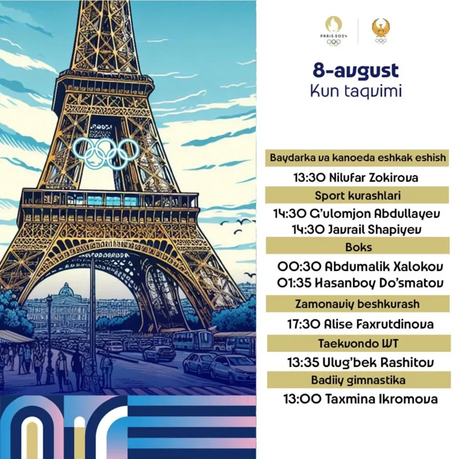 «Париж-2024»: 8 августа спортсмены Узбекистана будут защищать честь страны в шести видах спорта