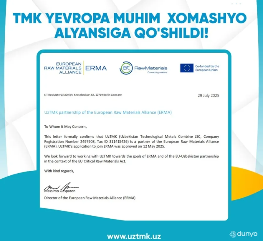 Сегодня ТМК официально присоединился к Европейскому альянсу критически важного сырья (ERMA) и укрепил позиции Узбекистана на глобальном рынке критических минералов. Мир вступил в новую эру критических минералов, и Узбекистан стремится занять в этом процессе ключевую позицию.