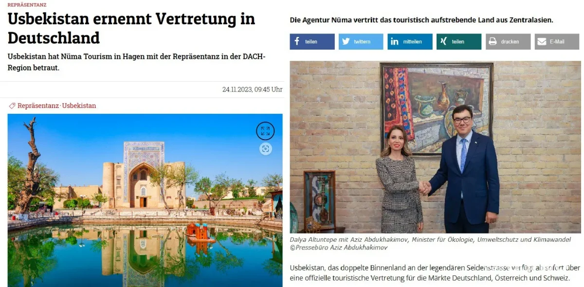 Отмечается, что Далия Алтунтепе имеет большой опыт сотрудничества с узбекскими партнерами, ее агентство «Nüma» специализируется на организации познавательных туров в Узбекистан и соседние страны Центральной Азии. По мнению экспертов, такое стратегическое партнерство станет важным фактором в развитии туристической индустрии Узбекистана и увеличении потока немецкоязычных туристов в нашу страну.