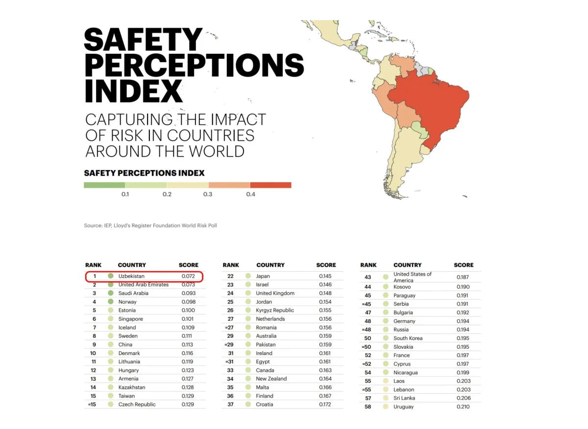 ТАШКЕНТ, 26 июля. /ИА «Дунё»/. Узбекистан в рейтинге самых безопасных стран мира "Safety Perception Index 2023" в который входит 121 страна занял 1-место, сообщает корреспондент ИА «Дунё».